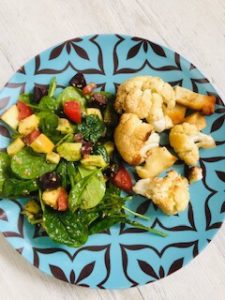 - Den Blumenkohl waschen, in Röschen zerteilen und den großen Strunk entfernen.Backofen auf 220 Grad vorheizen.Blumenkohl und Halloumi mit etwa 2 EL Olivenöl in eine Schüssel geben und mit den Gewürzen, sowie etwas Salz und wer möchte auch Pfeffer, vermischen. Dann alles auf ein Backblech verteilen und im Ofen (mittlere Schiene) goldbraun backen, gegebenenfalls wenden.Die gehakten Nüsse kurz vor Ende auf drüberstreuen.Dann mit z.Bsp. Salat anrichten und genießen 😋1 Blumenkohl, 40 gr gehackte Walnüsse, 2 EL Olivenöl, 1 TL Koriander, 1/2 TL Paprikapulver, 1 Packung Halloumi